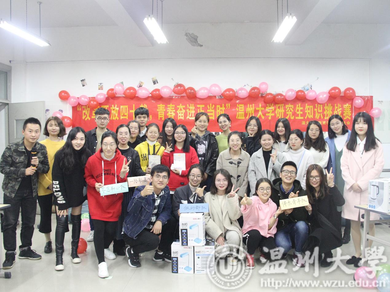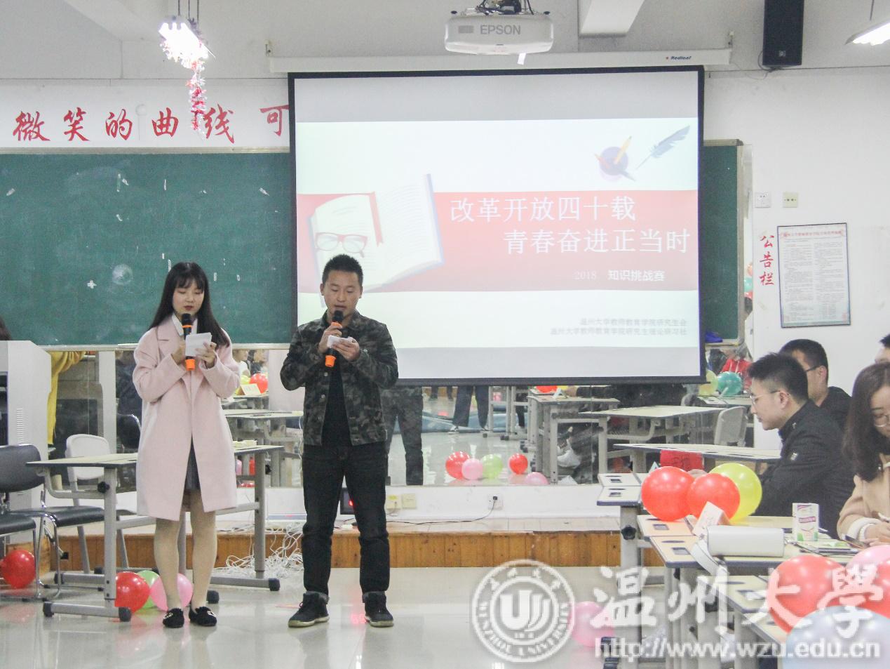壮阔东方史,奋进新时代,为纪念改革开放40周年,引导同学们学习改革开放进程和建校历史,发扬温大学子求学问是的精神、鼓舞敢为人先的斗志,11月23日晚6:00,由教师p站视频 研究生会主办的“改革开放四十载,青春奋进正当时”纪念改革开放四十周年知识挑战赛在南校区9B308拉开帷幕。伴随着选手的热情和欢快的音乐,主持人陈雨婷、田道文宣布比赛正式开始。