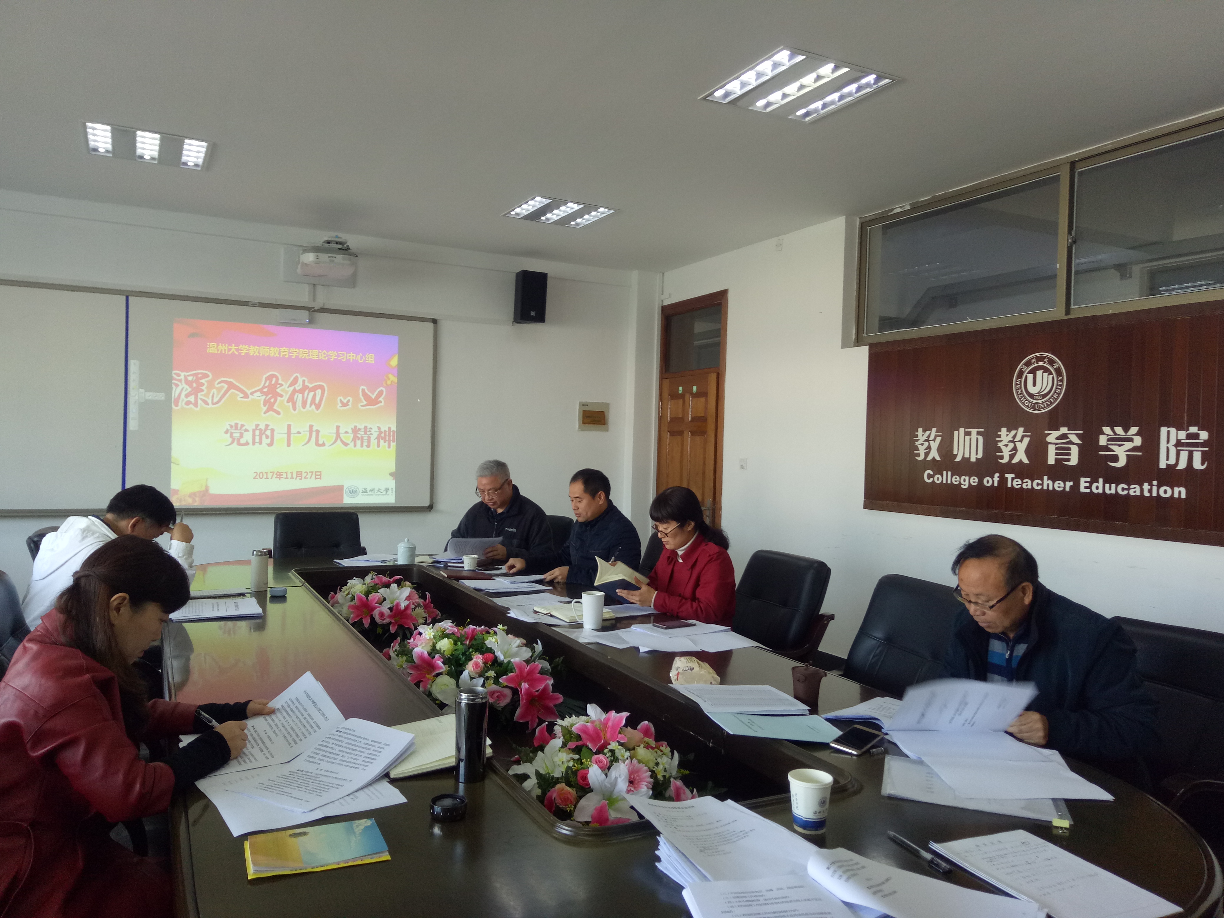 潘玉进同志结合新时代社会主要矛盾新变化,提出教育要满足人民对美好生活的需要,提出要以产教融合为支点,研究新时代教育的特征,办好“美”的师范教育,进一步推动“师范气质”人才培养工作。彭小明同志结合中国特色社会主义进入新时代这一新的历史方位,提出,这个“新时代”也是涵养国民素质的时代,是提升人民素养的时代,我们教育也要秉承“不忘初心、牢记使命”的要求,与时俱进发展好新时代的师范教育,为满足人民对教育的需求做贡献。杨丽君同志在谈到学习体会时指出,在深入学习贯彻党的十九大精神的时候,要努力做到内化于心,外化于行,要切实研究具体的举措与平台,落细落实在学院人才培养的各个方面。叶新东在谈学习体会时特别提到,要贯彻落实党的十九大提出的推进产教融合的工作,要按照学校建设高水平应用型大学的目标,依托校地合作、校企合作、校际合作的平台,以创新引领学院教育学科的发展。