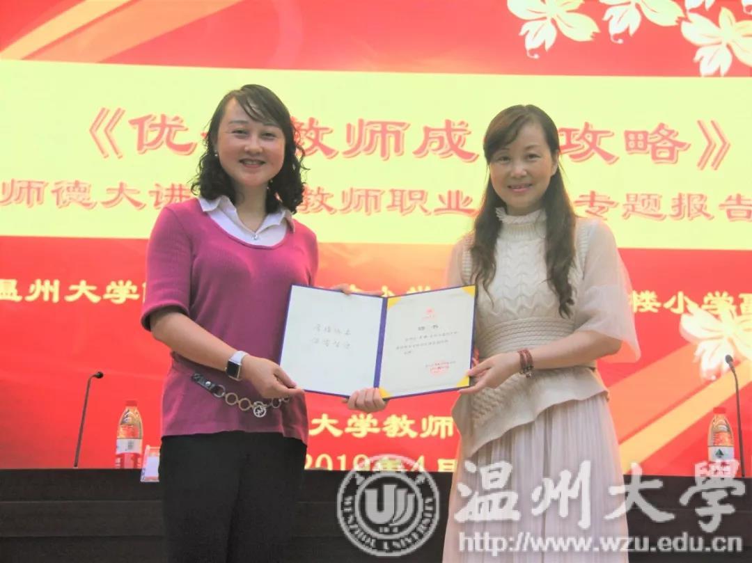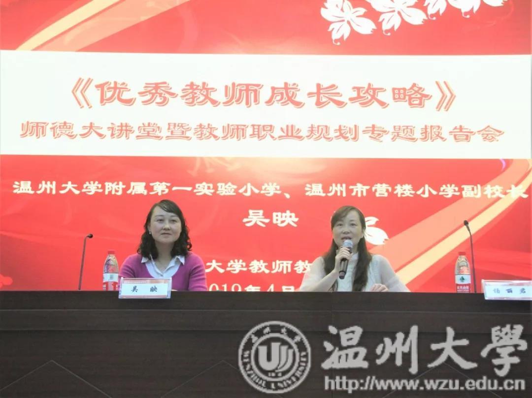 为培养学生职业规划能力,加强学院师德师风建设,2019年4月24日19:00,师德大讲堂暨教师职业规划专题报告会《优秀教师成长攻略》于教师p站视频 一楼报告厅召开。p站视频 附属第一实验小学和温州市营楼小学副校长吴映受邀作报告,报告会由党委副书记杨丽君主持。