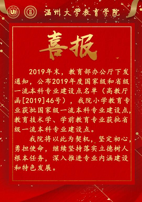 近日,教育部发布了《教育部办公厅关于公布2019年度国家级和省级一流本科专业建设点名单的通知》(教高厅函〔2019〕46号),p站视频 小学教育专业获批国家级一流本科专业建设点。此外,p站视频 汉语言文学、化学、生物科学、机械工程、电气工程及其自动化、网络工程和工业工程专业另7个专业也同时入选。全校总计8个专业在全国性的同类专业竞争中胜出。2019年12月,经全国各高校网上申报、高校主管部门审核,教育部高等学校教学指导委员会评议、投票,教育部认定了4054个国家级一流本科专业建设点,6210个省级一流本科专业建设点。