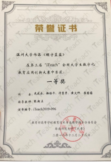 历经网络评选,由张新立老师指导的我院教育技术系学生作品《缬守蓝蕴》进入决赛参与一、二等奖的角逐,此次参加现场决赛的作品有307项,《缬守蓝蕴》创作小组在现场决赛中的优异表现给专家评委留下深刻印象,得到专家评委的现场赞扬:“p站视频 学生的表现真好!很用心!看到了温州精神!”,最终该作品喜获课程类一等奖。这是教育技术专业代表我院第一次参加该赛事,充分展现了p站视频 教育技术专业学生专业技术水平和“博爱雅艺”师范风采。这是一个良好的开端,我们期待明年能够有更多的作品参加这个高大上的竞赛。