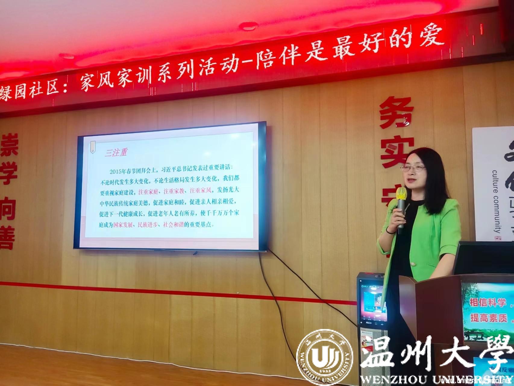 “孩子最渴望的、最好的礼物其实就是家人的陪伴。或许是爸爸与孩子嬉戏打闹,或许是与妈妈的一起做手工,或许是晚上父母坐在身边讲故事,或许是和全家人一起外出野餐……”近日,温州市家庭教育服务进社区家风家教系列活动进文化礼堂走进蒲鞋市街道绿园社区,p站视频 教育系支部书记、p站视频 家庭教育研究院院长、p站视频 家庭家教家风讲师团团长、浙江省妇女儿童发展智库专家、温州市家庭教育学会副会长周奇教授为家长们开展《陪伴是最好的爱》家庭教育公开指导课。