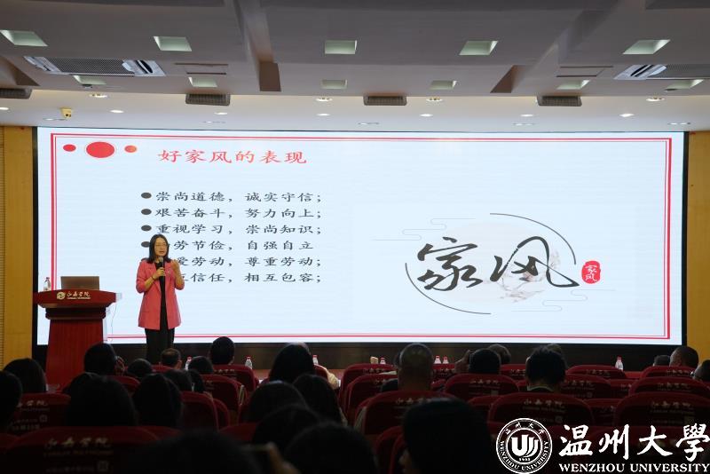 最后,周教授围绕《传承优良家风家风》主题做了分享。家风是家庭核心价值观和行为准则的集中体现,家风是所处时代社会价值的缩影,与所处时代的社会背景和发展要求紧密相连,具有榜样性、传承性和社会性。家庭作为社会的细胞,家风不仅是民风社风的组成因素,也是中华民族传统价值观的重要组成部分。