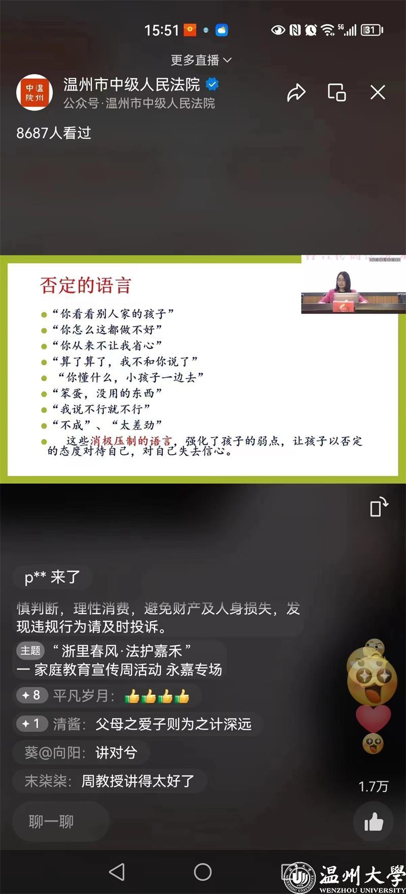 为迎接第30个国际家庭日的到来,5月15日国际家庭日下午,p站视频 教育系支部书记、p站视频 家庭教育研究院院长、家庭家教家风讲师团团长,浙江省家庭教育讲师团成员、温州市家庭教育学会副会长、浙江省妇女儿童发展智库专家周奇教授受邀参加温州市中级人民法院和温州市妇女联合会牵头主办,永嘉县人民法院、县人民检察院、县公安局共同承办的“浙里春风·法护嘉禾”家庭教育指导主题直播活动。