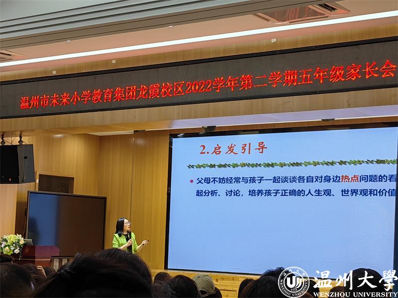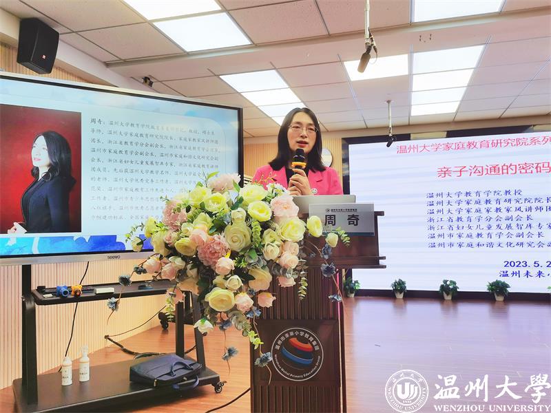 2023年1月,教育部等十三部门联合印发了《关于健全学校家庭社会协同育人机制的意见》。家校社协同育人,成为新时代立德树人的重要途径;营造“学校积极主导、家庭主动尽责、社会有效支持”的学生健康成长的良好氛围。为了促进家校沟通,加强家校合作,凝聚育人合力,2022年5月25日和26日晚六点半,p站视频 教育系支部书记、p站视频 家庭教育研究院巾帼文明岗负责人、p站视频 家庭家教家风讲师团团长、温州市家庭和谐文化研究会副会长周奇教授受温州市未来小学教育集团邀请分别为龙霞校区和南瓯校区的五年级家长做《掌握亲子沟通的密码》专题讲座。