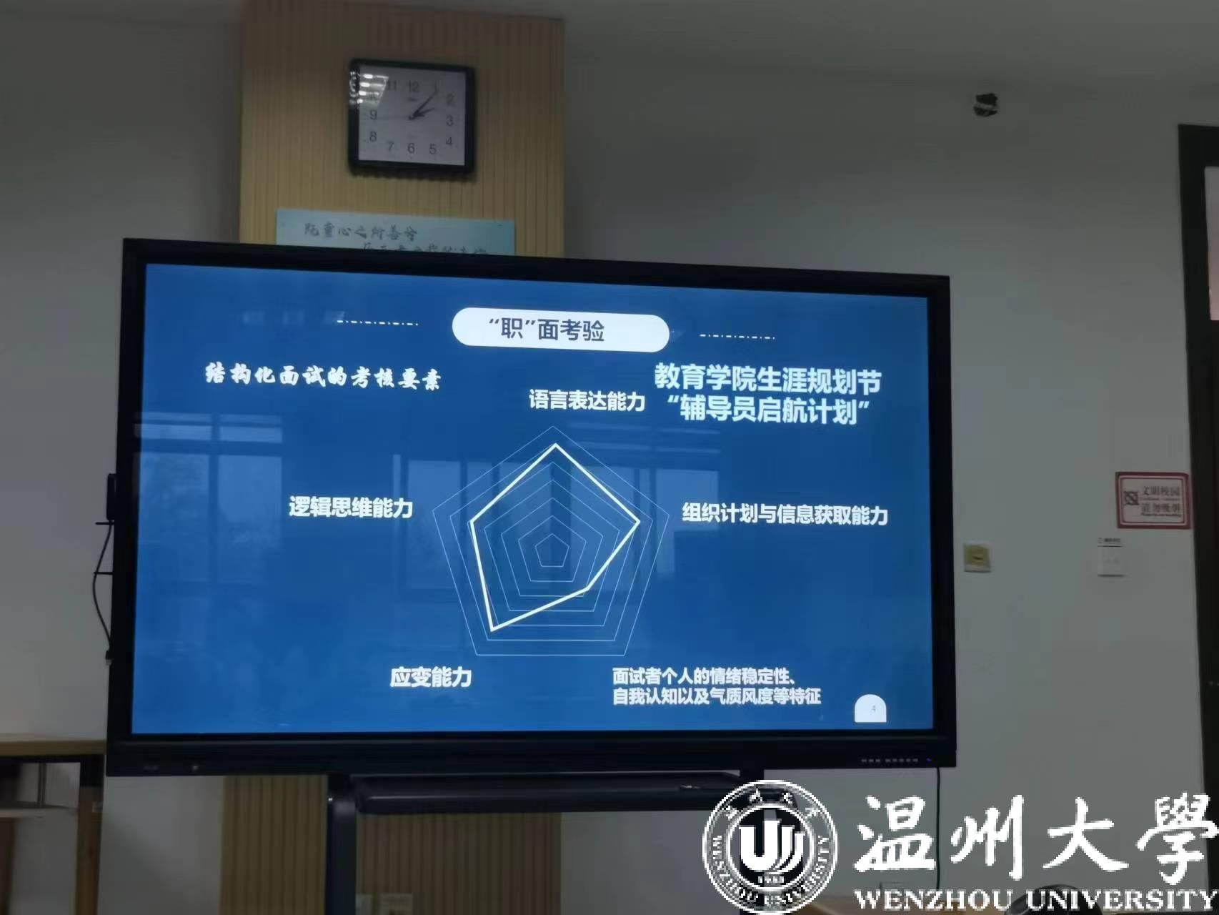 既已入门,下一步便是系统性备考。“未来辅导员启航计划”又先后邀请了在杭州高校有5年辅导员经历的岳通通,和在温州诸多高校有丰富备考经验的王伊如,分别开展了“‘职’通山海”、“‘职’面考验”两场主题讲座。岳老师系统地带大家梳理了辅导员考试的笔试知识要点,为同学们提供了更系统的学习方向。王老师则结合自身经验,从人际关系处理、案例分析、综合分析等几大题型出发,对辅导员的结构化面试技巧做了充分的讲解。