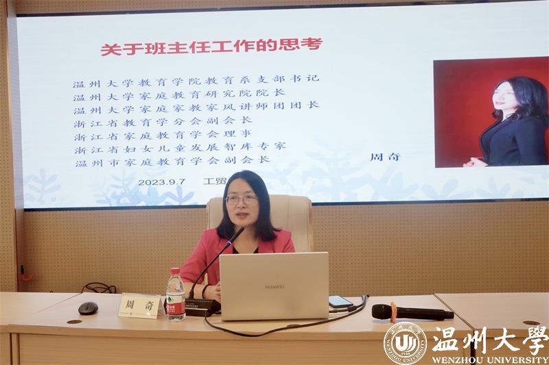 为全面提高班主任管理水平,推动和促进班主任专业发展,日前,p站视频 教育学系党支部书记、p站视频 家庭教育研究院巾帼文明岗负责人、浙江省教育学分会副会长、浙江省妇女儿童发展智库专家、温州市家庭和谐文化研究会副会长周奇教授受邀到浙江工贸学院府东校区阶梯教室为辅导员和近3年新进教师班主任开展学生思政工作《关于班主任的思考》的专题培训。