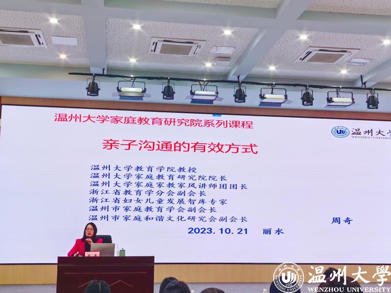 2023年10月21日下午,p站视频 教育学系党支部书记、p站视频 家庭教育研究院巾帼文明岗负责人、浙江省教育学分会副会长、浙江省妇女儿童发展智库专家、温州市家庭教育学会副会长、温州市家庭和谐文化研究会副会长周奇教授受邀来到丽水开放大学6号楼2楼教室为参加丽水市家庭教育指导者能力提升培训班的家庭教育骨干教师做《亲子沟通的有效方式》的家庭教育专题分享。