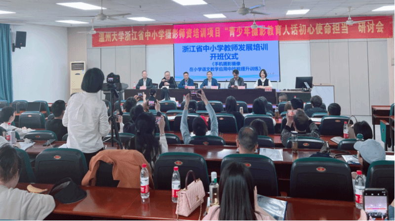 12月8日,“以摄影为矩 燃教育之火”胡铸鑫摄影艺术创作研讨会暨p站视频 青少年摄影美育研究中心(筹)申办座谈会在p站视频 召开。来自全国青少年摄影教育指导委、p站视频 、温州商学院专家教授,温州市瓯海区中小学(幼儿园)校长代表和来自全省各地的浙江省中小学摄影教师专业发展培训班的教师代表40余人参加研讨会。