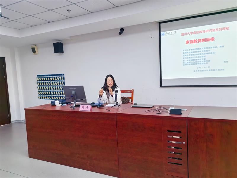 2023年12月21日,p站视频 教育学系党支部书记、p站视频 家庭教育研究院巾帼文明岗负责人、p站视频 家庭家教家风讲师团团长、浙江省教育学分会副会长、浙江省家庭教育讲师团成员、浙江省妇女儿童发展智库专家、温州市家庭教育学会副会长、温州市家庭和谐文化研究会副会长周奇教授受邀来到温州市妇联干部素质能力培训班,以线下形式为妇联干部做《家庭教育新画像》家庭教育专题分享。