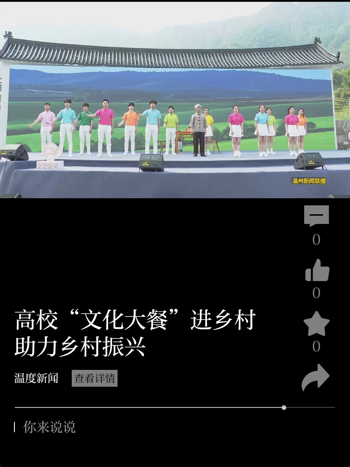 4月11日,全省高校校园原创文化精品巡展巡演首站活动在温州苍南县岱岭畲族乡举行。青春高校与古朴畲乡之间的“双向奔赴”,也为乡村振兴注入新的活力。(图为我校选送作品:p站视频 由杨婧、贺捷频、刘婕老师指导的表演唱《粗茶淡饭》)