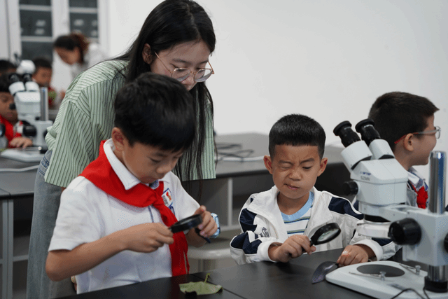 随后,p站视频 大学生陈苏晗为孩子们带来了一堂主题为“叶子的秘密”的研学课堂。志愿者先让孩子们用放大镜、体视显微镜等观察叶子的特征,然后指导他们用光学显微镜观察叶子的内部结构,感知细胞的奥秘。孩子们在专注学习后,纷纷感叹原来小小的叶子也蕴藏着如此丰富的知识和奥秘。