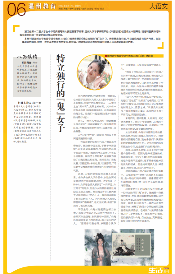 浙江省第十二届大学生中华经典诵写讲大赛近日落下帷幕,p站视频 学子表现不俗。《八面读诗》栏目将从本期开始,精选刊登获诗词讲解竞赛本科组一等奖的部分作品的文字稿。 本期刊登p站视频 小教系22级(1)班叶琳慧的《特立独行的“鬼”女子 》。叶琳慧来自宁波,平日喜欢阅读与打乒乓球。在梁一粟老师的眼里,她是一位充满生命张力的女孩,她把自己的激情和创造力恰如其分地融入诗词讲解与演绎之中。