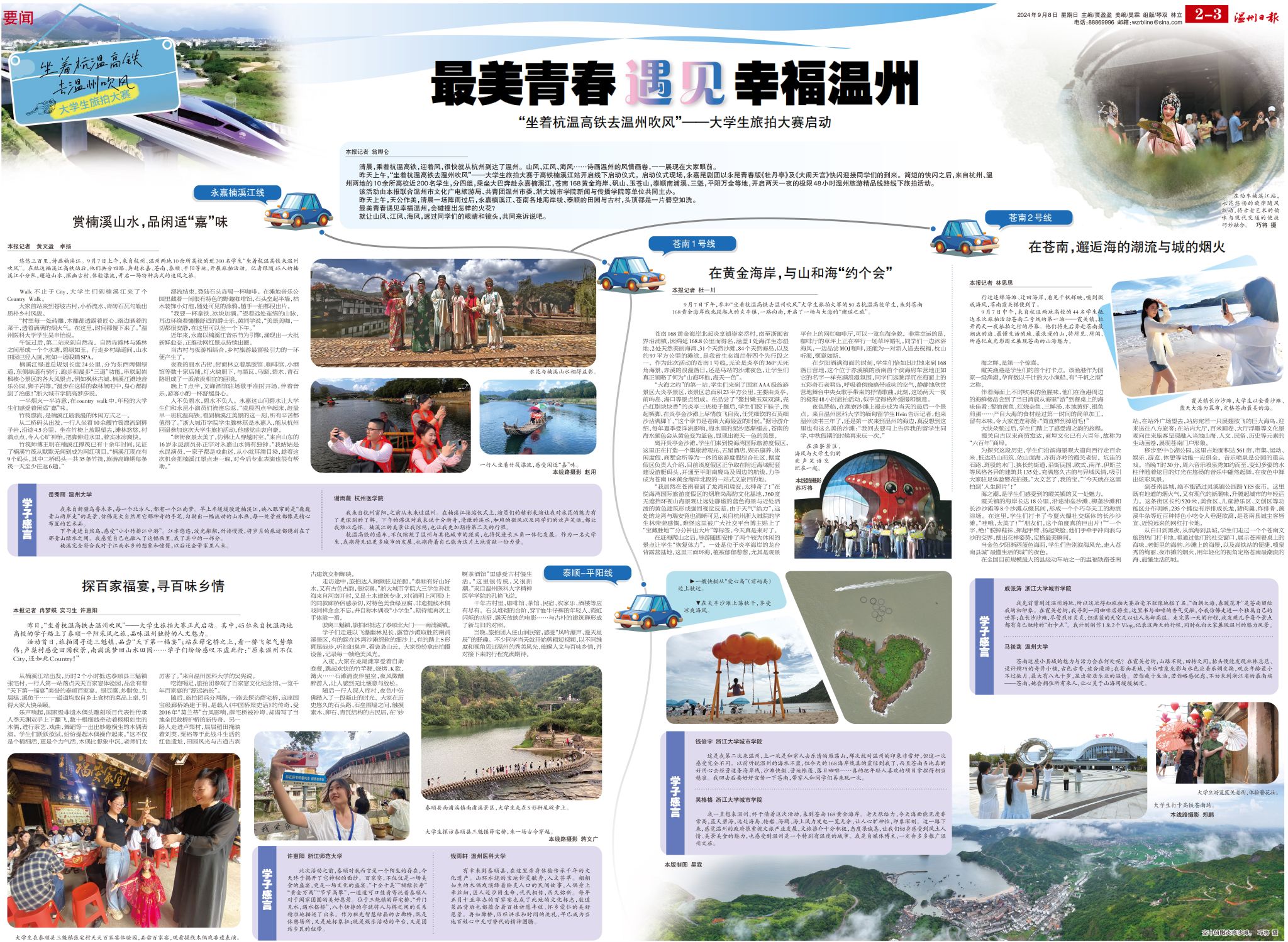 悠悠三百里,诗画楠溪江。9月7日上午,来自杭州、温州两地10余所高校的近200名学生“坐着杭温高铁来温州吹风”。在抵达楠溪江高铁站后,他们兵分四路,奔赴永嘉、苍南、泰顺、平阳等地,开展旅拍活动。记者跟随45人的楠溪江小分队,邂逅山水、探幽古村、体验漂流,开启一场特种兵式的追风之旅。