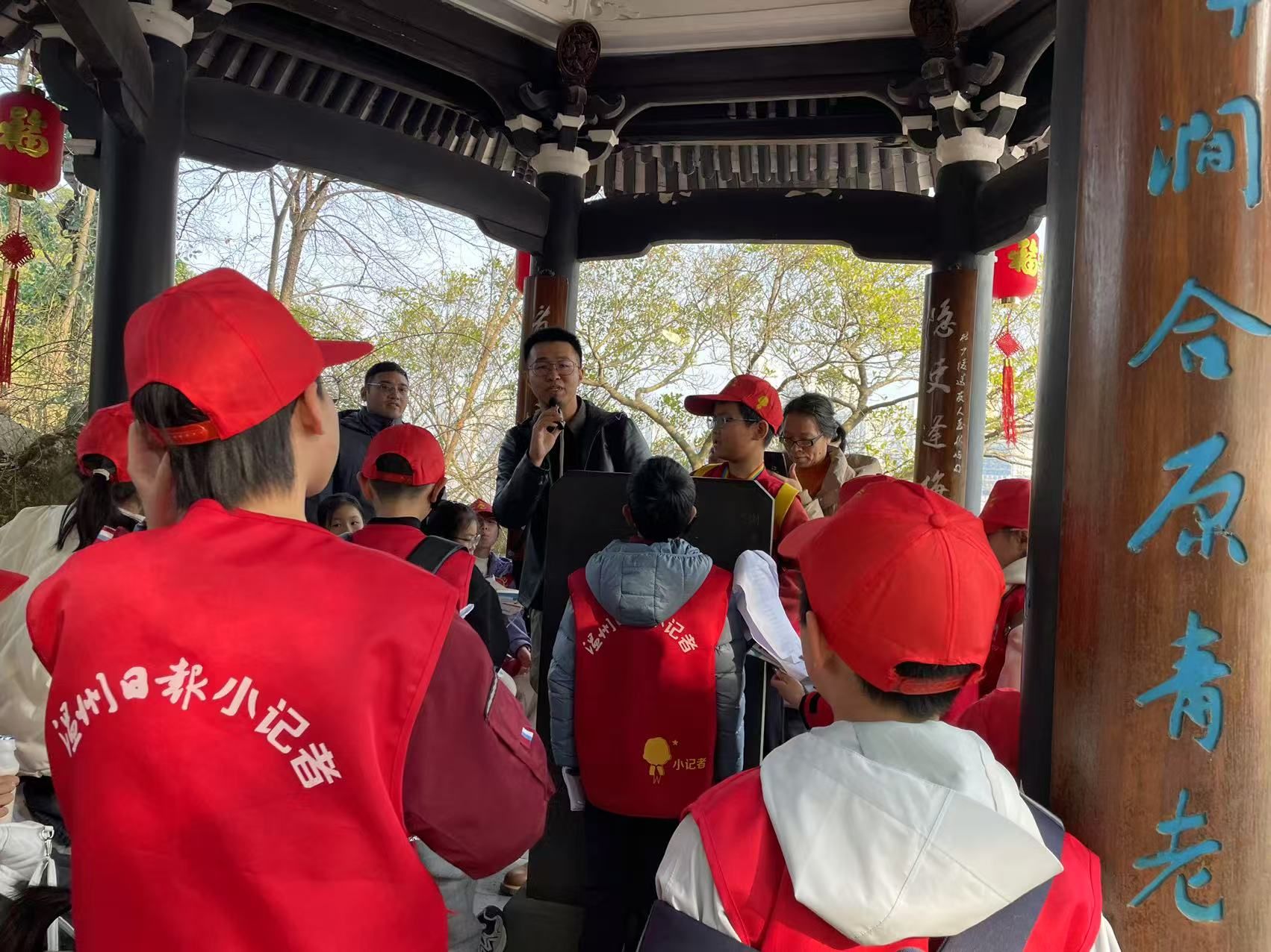 “当谢灵运离开晋都城金陵,南下永嘉郡城赴任太守的时候,他面对的是被贬的失意和仕途不明朗的境遇。”相传在孤屿西山下有一古亭,是谢氏常观江景之处,后称“谢公亭”。谢公亭前,梁一粟为小记者逐句“拆解”《登江中孤屿》背后的故事,“‘表灵物莫赏,蕴真谁为传’,表面上是谢灵运感叹江心屿空有美景却无人传写的遗憾,其实他也将自己比作美景,以双关寓意无人欣赏的情绪。”“不愧是山水诗鼻祖,把水天一色、清澈鲜丽的景色写得美轮美奂。”小记者庄皓宇说。