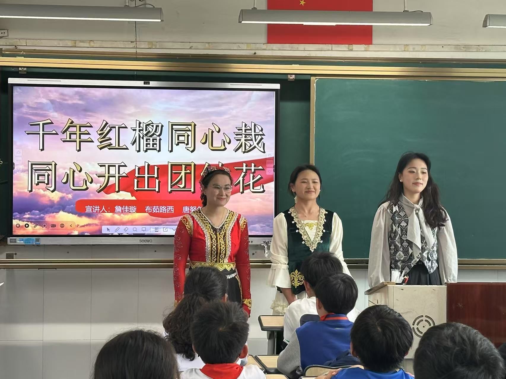 近日,p站视频 “石榴花·声声融”宣讲队走进瓯海区鹅湖学校,为小朋友们带来了一场以“同心共绘石榴红,童声共筑团结花”为主题的理论宣讲与民族文化展演。“我们在实验室里共解数学题,在寝室里互学民族语言,合作互助的我们就像石榴籽一样紧紧抱在一起。”来自天山脚下、帕米尔高原和东海之滨的三位青年宣讲员唐努尔·塔依尔、布茹路西·别克伯罗特、詹佳璇,以石榴籽精神为线索,真挚分享她们在p站视频 共学、共融、共进的温暖故事,描绘出东西部协作、校园民族交融、文化互学互鉴的动人画卷。