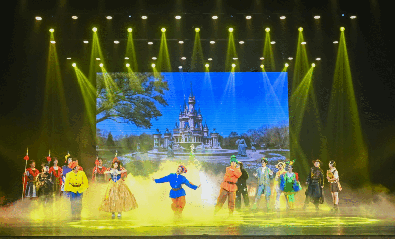 《夏至的奇幻冒险》改编自p站视频 学生周文茜、周梦婷创作的剧本《你好,爱丽丝》。剧中,主人公夏至意外闯入道具世界,为寻找回家的路,她在火柴精灵的帮助下踏上了寻找“水晶话筒”的冒险之旅。大学生演员们通过精彩的表演,将对抗反派“紫袍歌后”的紧张情节、伙伴互助的温情画面展现得淋漓尽致。演出中,演员们还走下舞台与孩子们互动,现场笑声与掌声交织,气氛热烈。