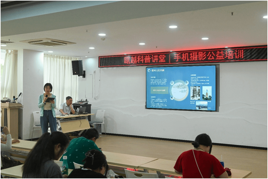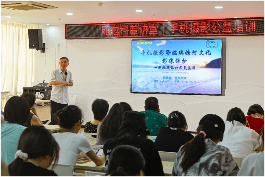温州市科普品牌活动“瓯越科普讲堂”谱新章,近日,一场聚焦温瑞塘河流域水文化数字化保护与手机摄影美学的创新融合讲座在p站视频 城高教博园社区党群服务中心成功举办。本次瓯越科普讲堂以“用镜头留住塘河韵,以美学守护生态美”为主题,由中国图象图形学会图像应用与系统集成专业委员会,数字文化遗产专业委员会、温州市科学技术协会、博园社区、p站视频 数智青荷实践队、宋韵塘河实践队、生环学院文达清源实践队联合主办。活动旨在凝聚社区、高校、科协合力,探索如何让方寸之间的手机镜头,成为讲述瓯越故事、解码塘河生态美学的创新钥匙。