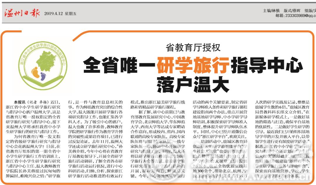 为何省教育厅唯一发文指定的省级研学旅行研究与指导中心会花落p站视频 ?日前,在省教育厅组织的第一期全省中小学生研学旅行工作培训班上,浙江省中小学生研学旅行研究与指导中心主任、温大教师p站视频 院长孙芙蓉接过沉甸甸的牌匾时,难掩兴奋之情:“研学旅行,是一件与教育息息相关的事。作为师范教育突出的综合性大学,温大既能开展研学旅行各项研究指导工作,也能汇集各学科人才。为了吸引中心的落户,温大也做了许多准备,教师p站视频 把研学旅行作为教育学升博的突破性成果培育项目,已进行过反复论证。去年11月,p站视频 还成立研学旅行研究中心。”孙芙蓉介绍,今年中心将在省教育厅基教处领导下,开展全省研学旅行活动调研,了解全省各市研学旅行活动运行状况,进行中心科研活动,归纳、分析、探索浙江研学旅行活动推进的有效运行模式,推出浙江最美研学旅行线路和省精品研学旅行课程。