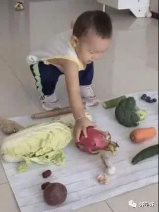 就地取材,家里囤的蔬菜水果派上用场,教娃认物,生动形象的道具似乎比图片更有说服力。