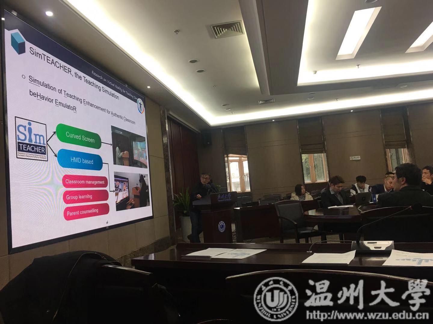 论坛上,中日韩教育技术学专家围绕教育教学中的虚拟现实技术应用成果,进行探讨交流。韩国全南大学柳志献教授就“关于教学模拟训练的虚拟现实环境开发研究”进行主旨发言。他指出情境学习、体验认知、情境兴趣是虚拟现实环境的核心因素,通过真实课堂行为模拟器的教学强化模拟,可以帮助师范生掌握课堂管理、指导学习、应对咨询等技能。而在日本福祉大学佐藤慎一教授看来,360度VR技术有助于体验式学习的分享与交流,也有利于缓解师范生的海外研修资金压力。来自温大教师p站视频 教育技术系的杨刚博士、邱创楷博士以及赵安平博士围绕SVVR虚拟现实技术的学习资源设计与开发,以及SVVR在基础教育中的教学应用做出的一系列实证研究进行了详细的介绍与分享,并指出未来中小学课堂借助虚拟现实资源能够强化学生的学习认知能力,提升学生学会学习的能力。