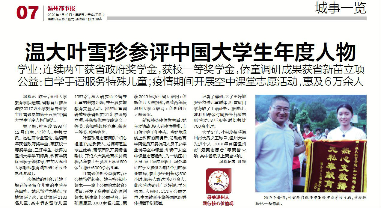 “坚守、向阳、担当,争做新时代青年追梦人”这是p站视频 2017级小学教育专业学生叶雪珍的座右铭,也是她的真实写照。7月9日,温大p站视频 透露,省教育厅推荐叶雪珍参评第十五届“中国大学生年度人物”评选。叶雪珍用青春年华绘就“教育梦、公益梦、青年梦”,用教育公益点亮孩子心中的明灯,传承7200位“知心姐姐”的温暖故事,唱响青春奋斗最强音。