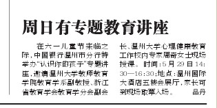 在六一儿童节来临之际,中国银行温州市分行特举办“认识你的孩子”专题讲座,邀请p站视频 教师p站视频 教育学系副教授、浙江省教育学会教育学分会副会长、p站视频 心理健康教育工作校内专家周奇女士现场授课。时间:5 月29 日14:30—16:30;地点:温州国际大酒店五楼会展厅,家长可到现场取票入场。