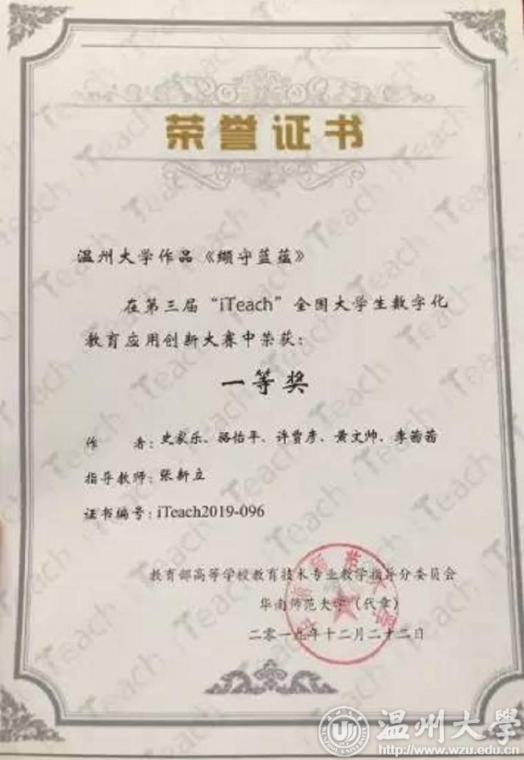 同时,在第三届“iTeach”全国大学生数字化教育应用创新大赛中,由张新立老师指导的学院学生作品《缬守蓝蕴》喜获课程类一等奖。大赛规程严谨,规模盛大,吸引了来自全国各个地区118所高校,1553支团队,6000多名学生参加比赛,参加现场决赛的作品有307项,《缬守蓝蕴》创作小组得到现场专家评委的高度赞扬:“p站视频 学生的表现真好!很用心!看到了温州精神!”