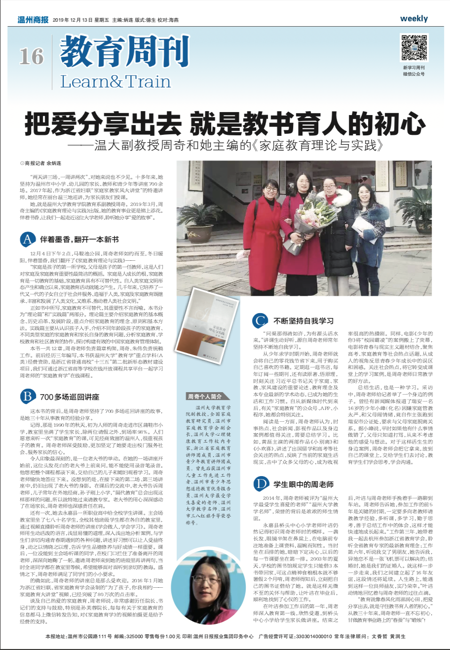她,就是p站视频 教育系副教授周奇。2019 年 3 月,周 奇主编的《家庭教育理论与实践》出版,她的教育事业更是锦上添花。 伴着书香,让我们一起走近这位大学老师,聆听她分享“爱的故事”。