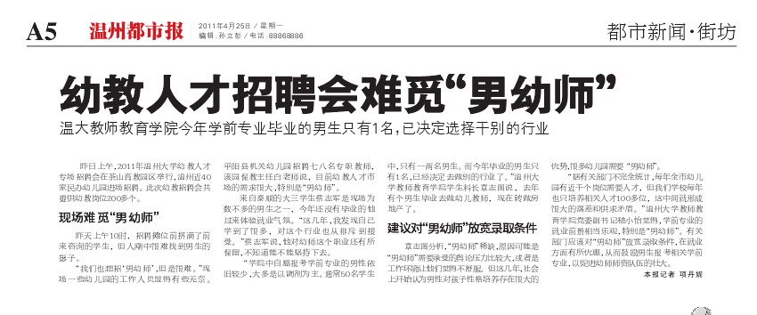 今年学前专业毕业的男生只有1名,已决定选择干别的行业2011-04-25