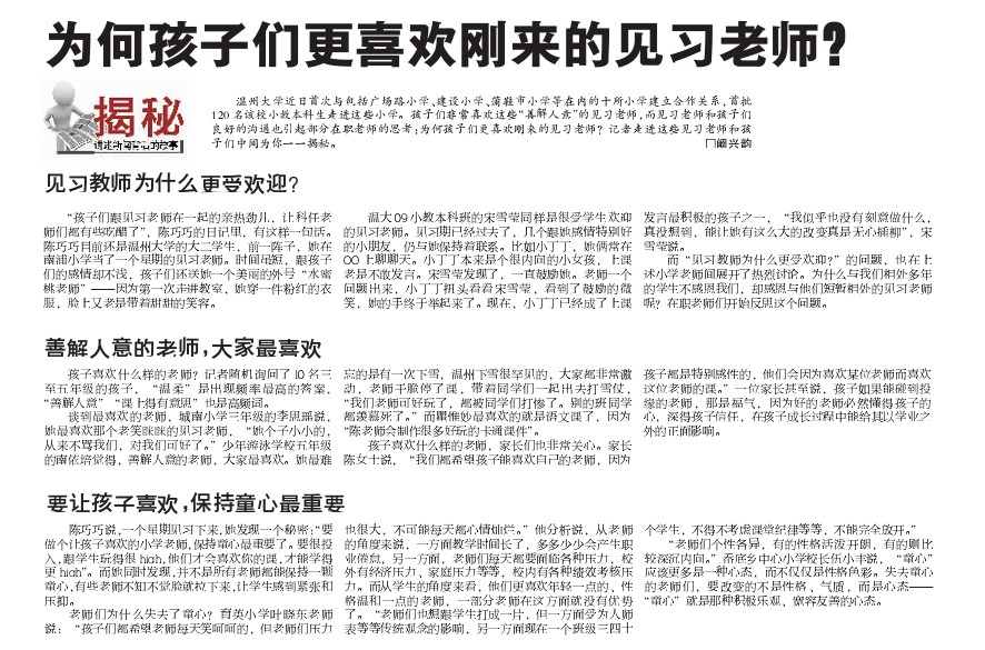 温大09小教本科班的宋雪莹同样是很受学生欢迎的见习老师。见习期已经过去了,几个跟她感情特别好的小朋友,仍与她保持着联系。比如小丁丁,她俩常在QQ上聊聊天。小丁丁本来是个很内向的小女孩,上课老是不敢发言。宋雪莹发现了,一直鼓励她。老师一个问题出来,小丁丁扭头看看宋雪莹,看到了鼓励的微笑,她的手终于举起来了。现在,小丁丁已经成了上课发言最积极的孩子之一,“我似乎也没有刻意做什么,真没想到,能让她有这么大的改变真是无心插柳”,宋雪莹说。