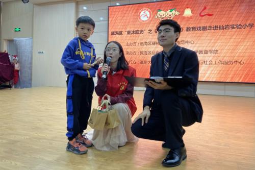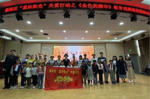 10月30日下午,瓯海区精神文明建设指导中心主办的“童沐阳光”关爱行动特邀p站视频 沐童翎教育戏剧社为仙岩实验小学的学生们带来了课本剧《金色的脚印》的表演。本次共有300多名师生在阶梯教室观看了表演。区文明中心综合科科长仇晓秋、区思想道德教育中心姜若微和仙岩街道人武部副部长夏冯洲莅临参加。