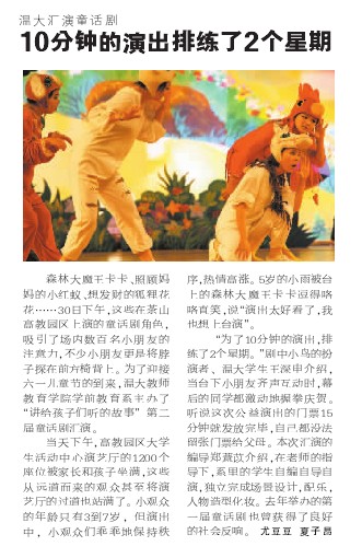 “为了10分钟的演出,排练了2个星期。”剧中小鸟的扮演者、温大学生王深申介绍,当台下小朋友齐声互动时,幕后的同学都激动地握拳庆贺。听说这次公益演出的门票15分钟就发放完毕,自己都没法留张门票给父母。本次汇演的编导郑薏苡介绍,在老师的指导下,系里的学生自编自导自演,独立完成场景设计,配乐,人物造型化妆。去年举办的第一届童话剧也曾获得了良好的社会反响。尤豆豆 夏子昂