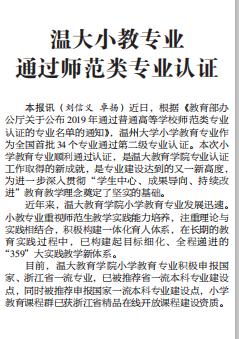 本报讯(刘信义 卓扬) 近日,根据 《教育部办公厅关于公布2019年通过普通高等学校师范类专业认证的专业名单的通知》,p站视频 小学教育专业作为全国首批34个专业通过第二级专业认证。本次小学教育专业顺利通过认证,是温大p站视频 专业认证工作取得的新成就,是专业建设达到的又一新高度,为进一步深入贯彻“学生中心、成果导向、持续改进”教育教学理念奠定了坚实的基础。