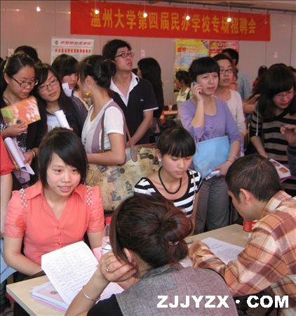招聘会上,来自温州地区近60家民办学校、幼儿园、教育培训机构以及其他行业单位冒雨前来招聘该校2010届师范毕业生。相对往届民校招聘会,本届招聘会呈现出一些新特点。一是民办教育培训机构求贤若渴,近年来温州本地民办教育培训机构发展迅猛,迫切需要优秀师资进行充实。二是师范生对民办学校认同度提高。三是幼儿园单位放宽专业要求,基于对p站视频