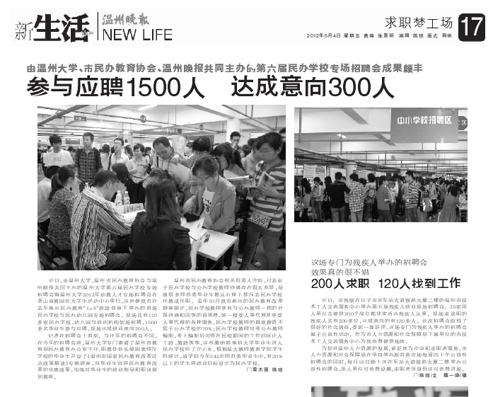 、市民办教育协会、温州晚报共同主办的第六届民办学校专场招聘会成果颇丰参与应聘1500人 达成意向300人 2012-05-04