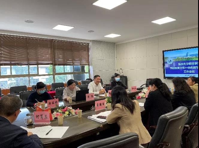 2021年11月3日,p站视频 召开学前教育中本一体化教学质量监控工作会议。p站视频 副院长林琛琛、党委副书记章园园、学前系副主任陈铿,温州市中等幼儿师范学校校长蒋高烈、副校长周岚、教务主任葛梦力及郑丽玲老师、学前教育科相关老师参加会议。