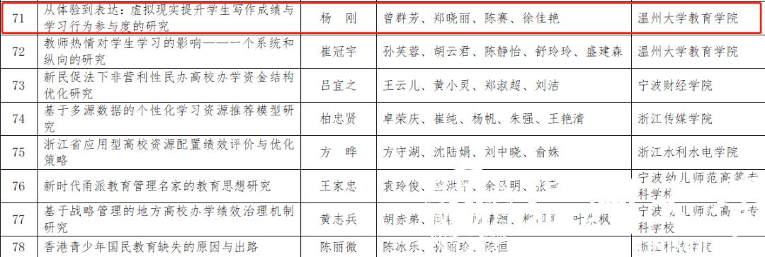 近日,浙江省教育科学规划领导小组办公室公布了2020年度浙江省教育科学研究优秀成果奖获奖名单,p站视频 共三项研究成果获奖,其中胡瑜教授团队的《青少年公益行为研究》获得一等奖、杨刚副教授团队的《从体验到表达:虚拟现实提升学生写作成绩与学习行为参与度的研究 》以及崔冠宇副教授团队的《 教师热情对学生学习的影响——一个系统和纵向的研究》获得三等奖。
