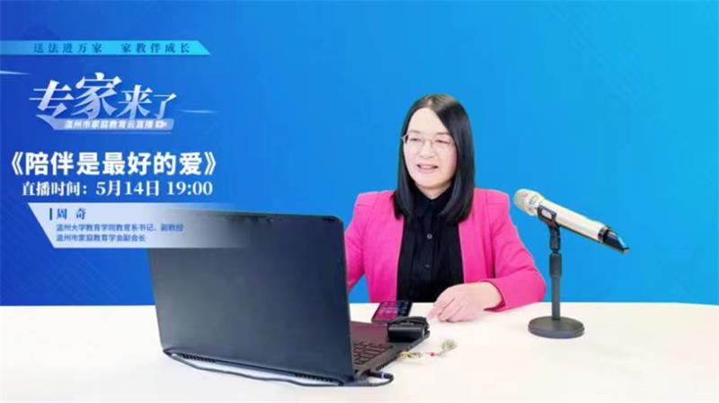 为深入贯彻习近平总书记关于注重家庭家教家风建设重要论述,将“重视家庭文明建设,努力使千千万万个家庭成为国家发展、民族进步、社会和谐的重要基点”重要精神落到实处,有力推动《中华人民共和国家庭教育促进法》宣传实施,2022年5月14日,在全国首个家庭教育宣传周期间,p站视频 教育系党支部书记、副教授、硕士生导师,p站视频 家庭教育研究院巾帼文明岗岗长、p站视频 家庭家教家风讲师团团长、浙江省教育学分会副会长、浙江省家庭教育学会理事、温州市家庭教育学会副会长周奇做客“专家来了”温州市家庭教育云直播,开展《陪伴是最好的爱》家庭教育公开指导课。本次直播以“送法进万家 家教伴成长”为主题,旨在弘扬传承中华民族家庭美德,树立良好家风,推动形成家庭文明新风尚。整场直播吸引了12.5万人次观看,并获得2万多的网友点赞。