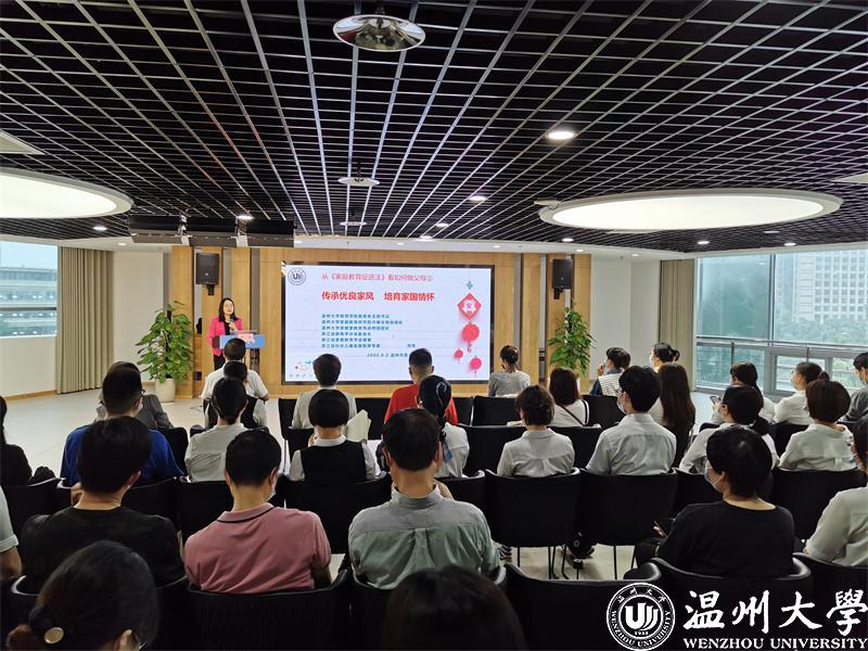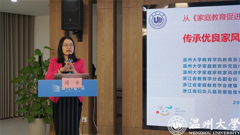 p站视频 教育学系党支部书记、p站视频 家庭教育研究院巾帼文明岗岗长、全国家庭工作先进个人、浙江省妇女儿童发展智库专家、浙江省家庭教育讲师团成员、家庭教育工作坊负责人周奇老师进行《传承优良家风 培育家国情怀》的主题讲座。
