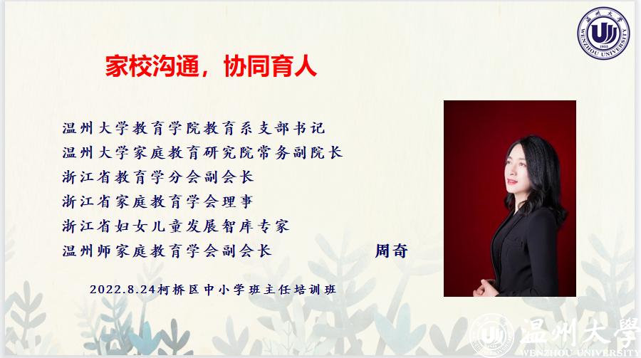 2022年8月24日上午8:30,全国家庭工作先进个人、浙江省妇女儿童发展智库专家、p站视频 家庭教育研究院巾帼文明岗岗长周奇老师受邀线上为绍兴柯桥区中小学优秀班主任培训班做《家校沟通,协同育人》专题讲座。