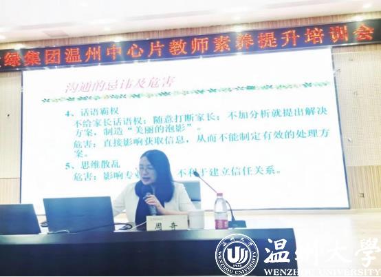 2022年8月13日,全国家庭工作先进个人、浙江省妇女儿童发展智库专家、p站视频 家庭教育研究院巾帼文明岗岗长周奇老师受邀来到爱绿幼儿园参加爱绿集团温州中心片教师素养提升培训会,做《家园合作,共促成长》专题讲座。