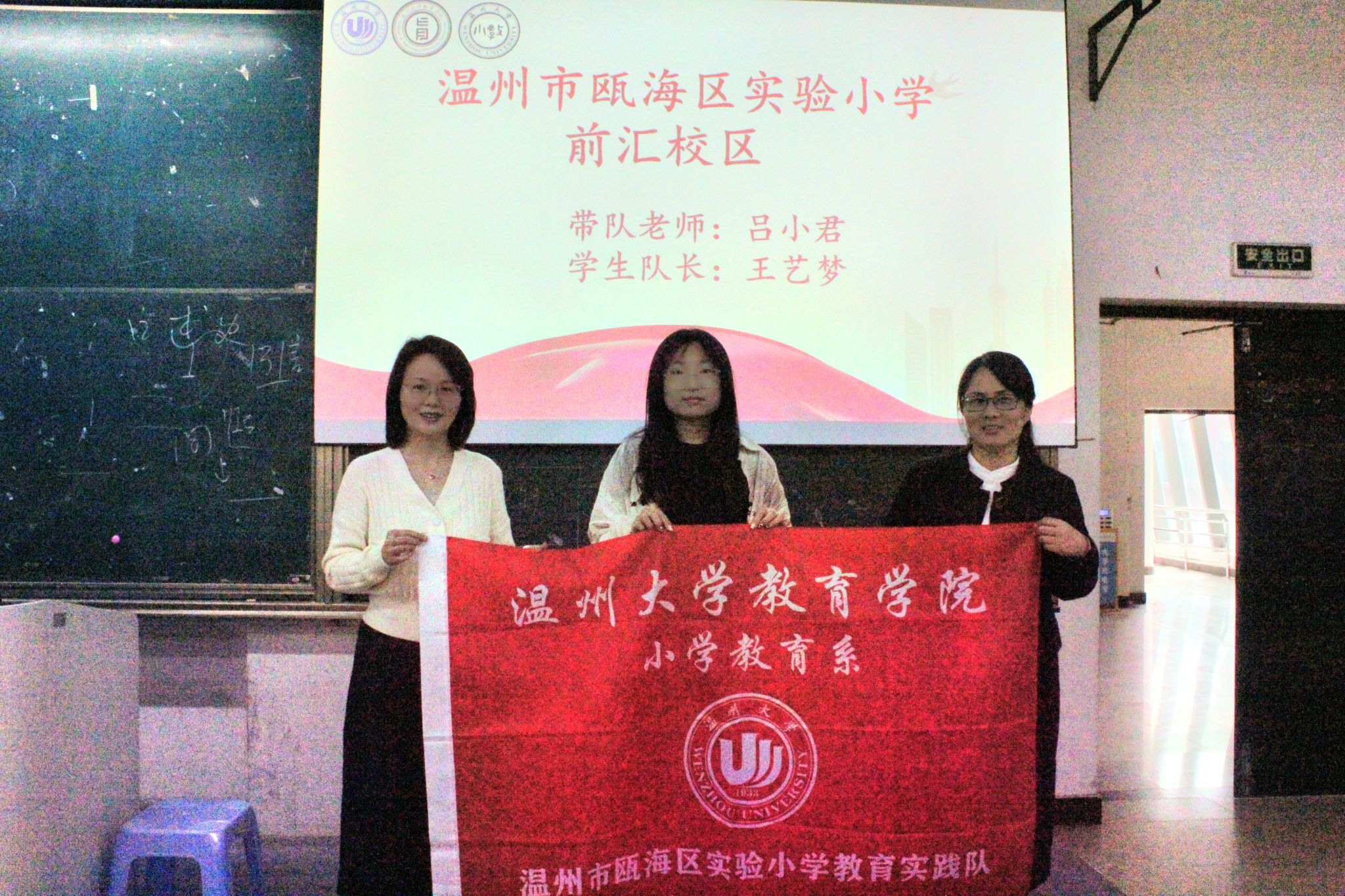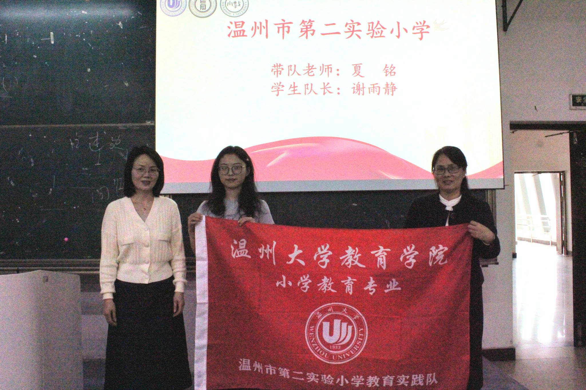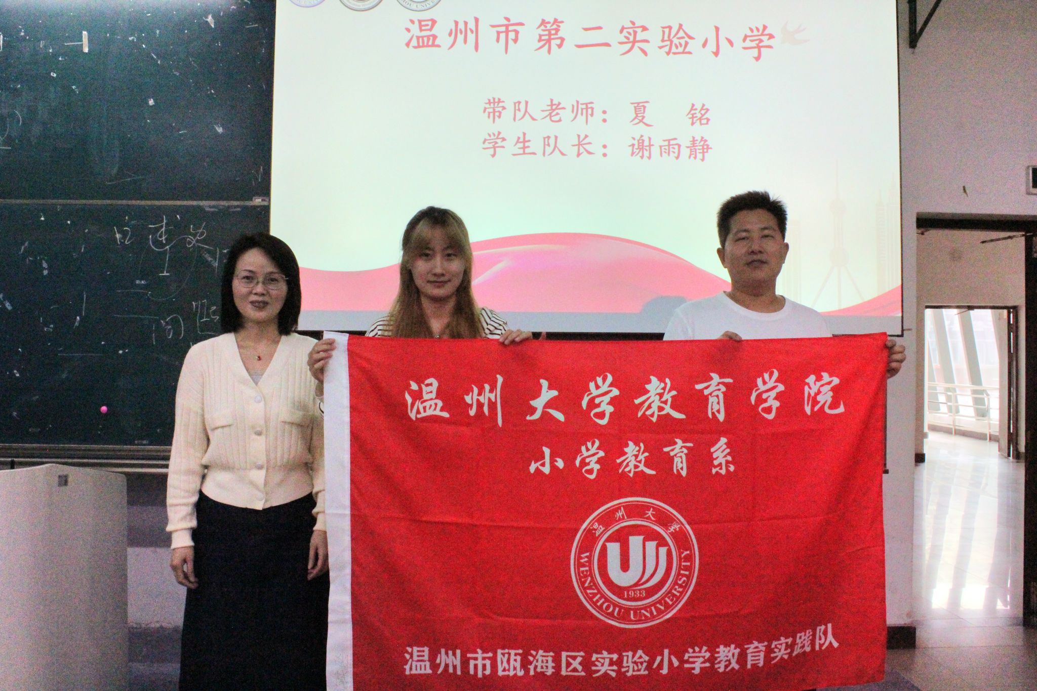 紧接着,小教系金丽芳书记为各见习学校的带队老师和队长授旗。