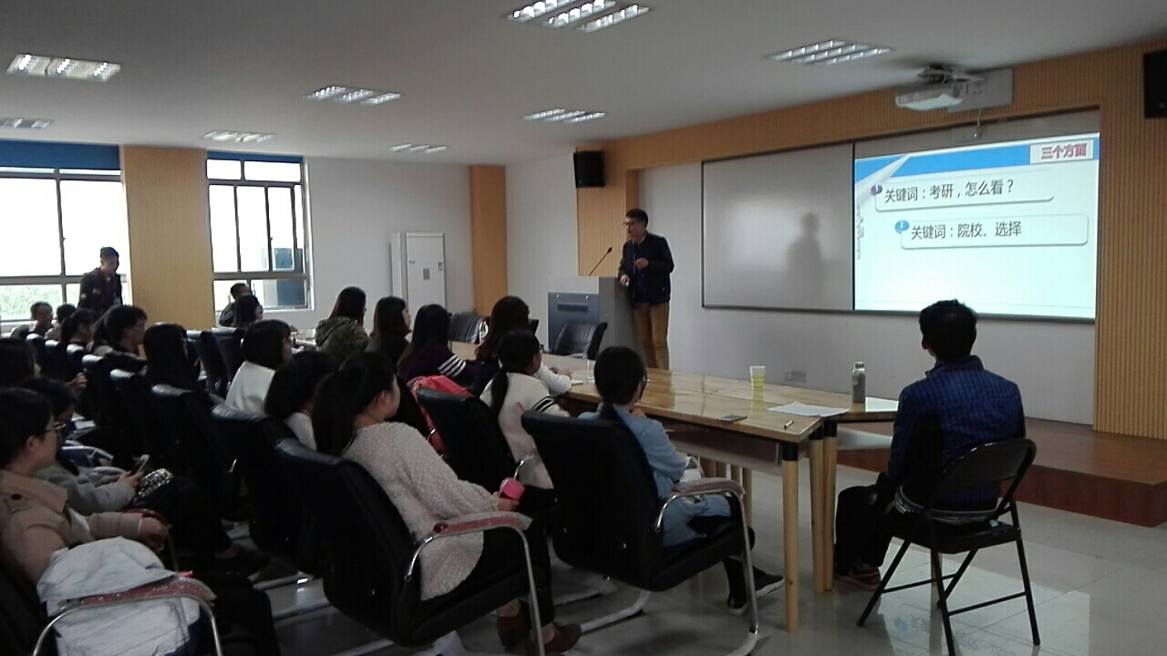 会议开始,由课程与教学论(综合)专业16级研究生潘龙飞开讲,他主要围绕“为什么要考研?”“院校如何选择?”“考研各个阶段的时间如何把握?”这三个方面展开。与此同时,生动的讲述了他在复习考研过程中的一些难忘的事迹,分享了他在考研过程中每个阶段心态转变的过程。最后,用汪国真先生《热爱生命》的诗句“既然选择了远方,便只顾风雨兼程!”鼓励学弟学妹们,勇敢的去追寻自己的考研梦。