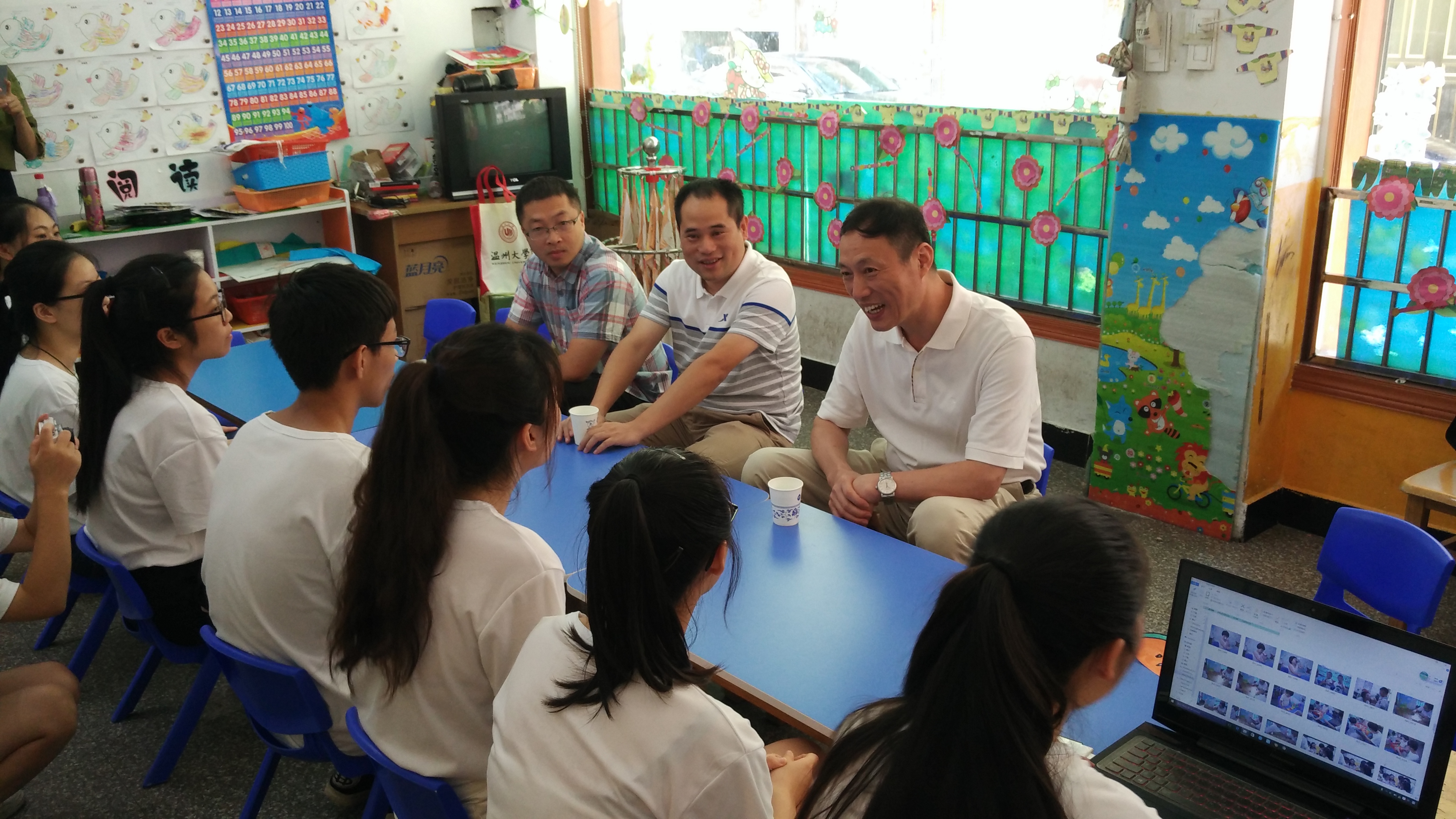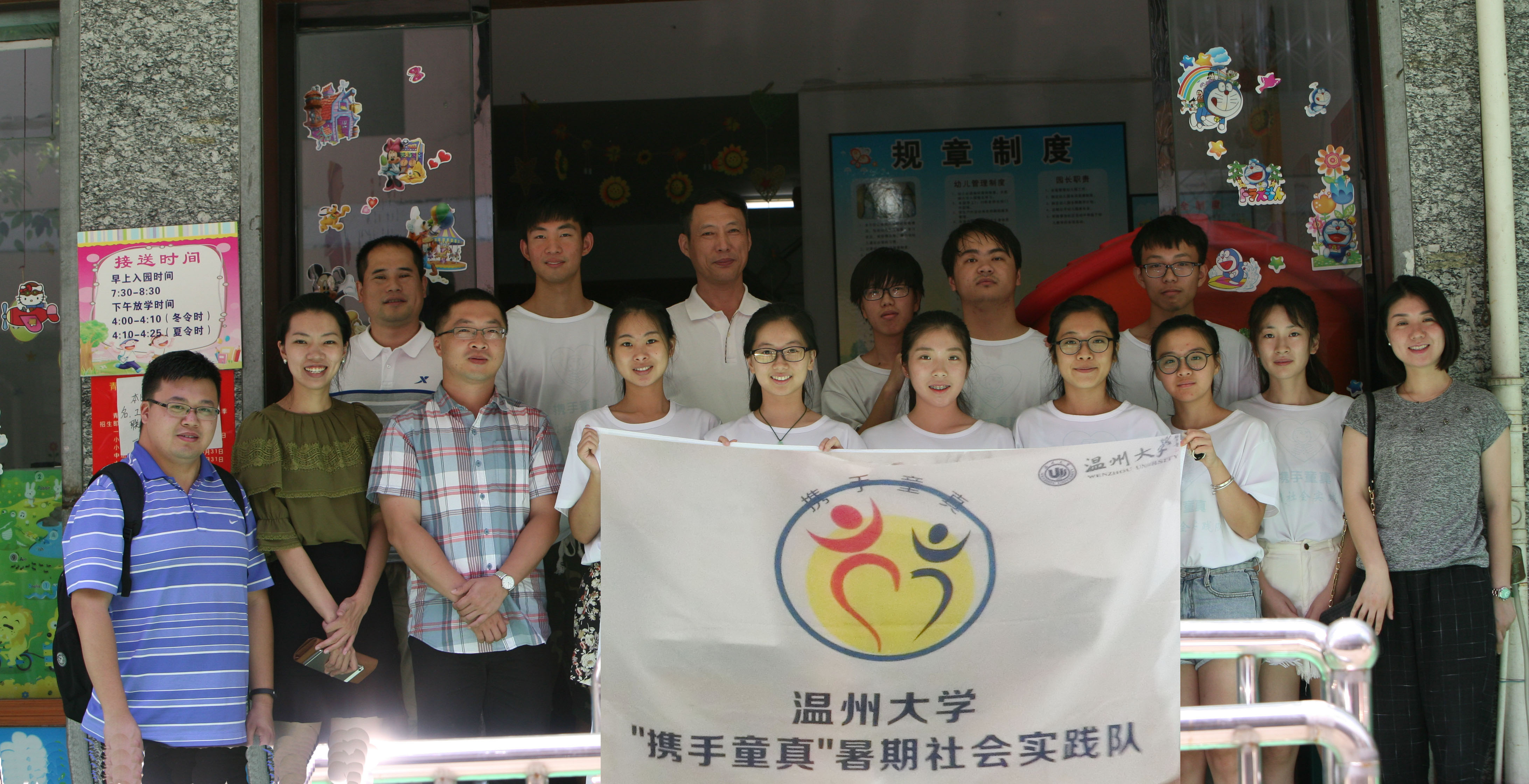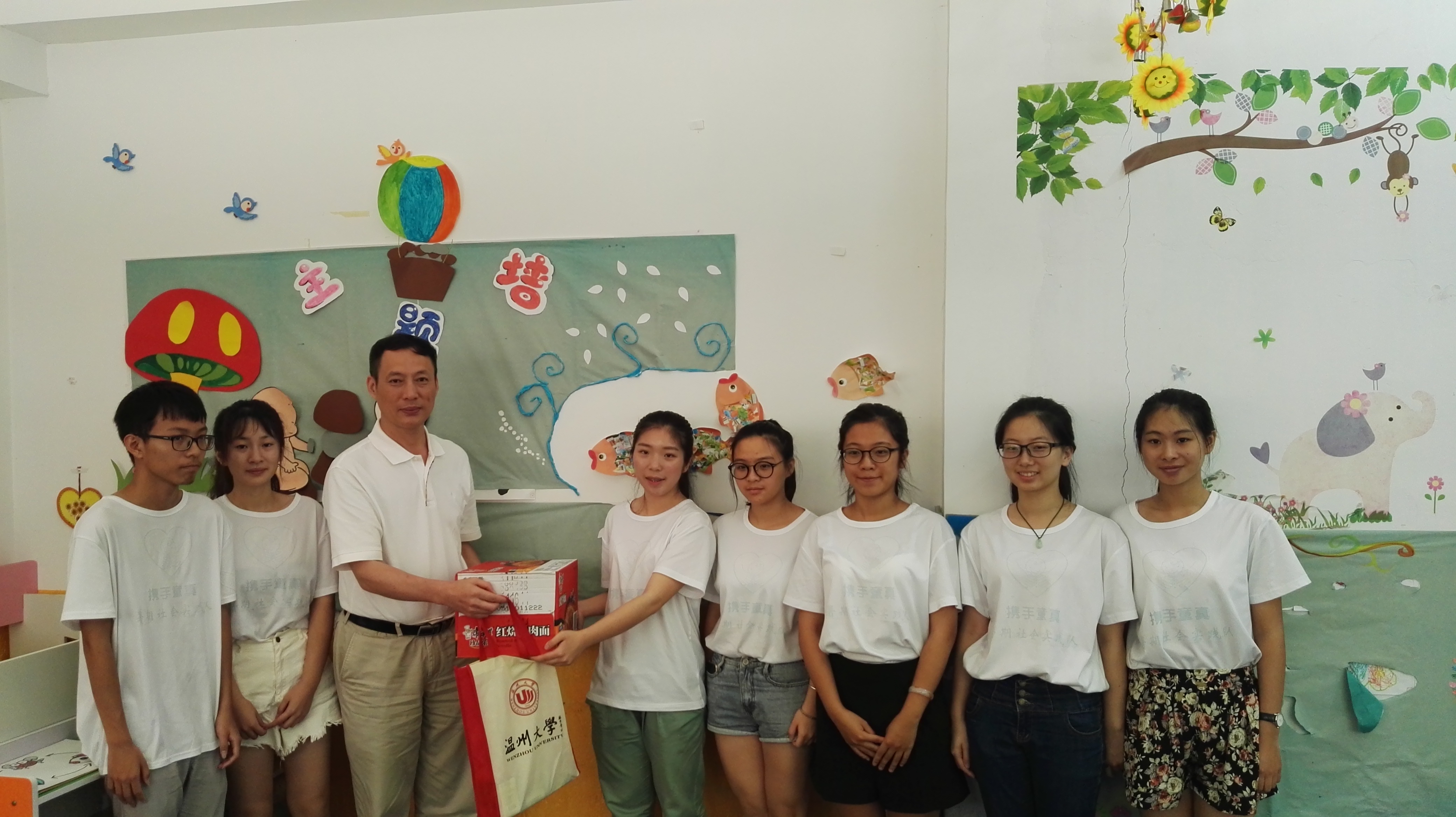 党总支书记杨立淮老师、校团委屠霁霞书记、魏一副书记、胡震鹏老师、学生科辅导员严晓秋老师一行人来到丽水青田好孩子幼儿园为我们携手童真实践队带来了温情的慰问,不仅送来了许多慰问品,更重要的是,在肯定我们实践队的同时,给予了我们许多宝贵的建议。