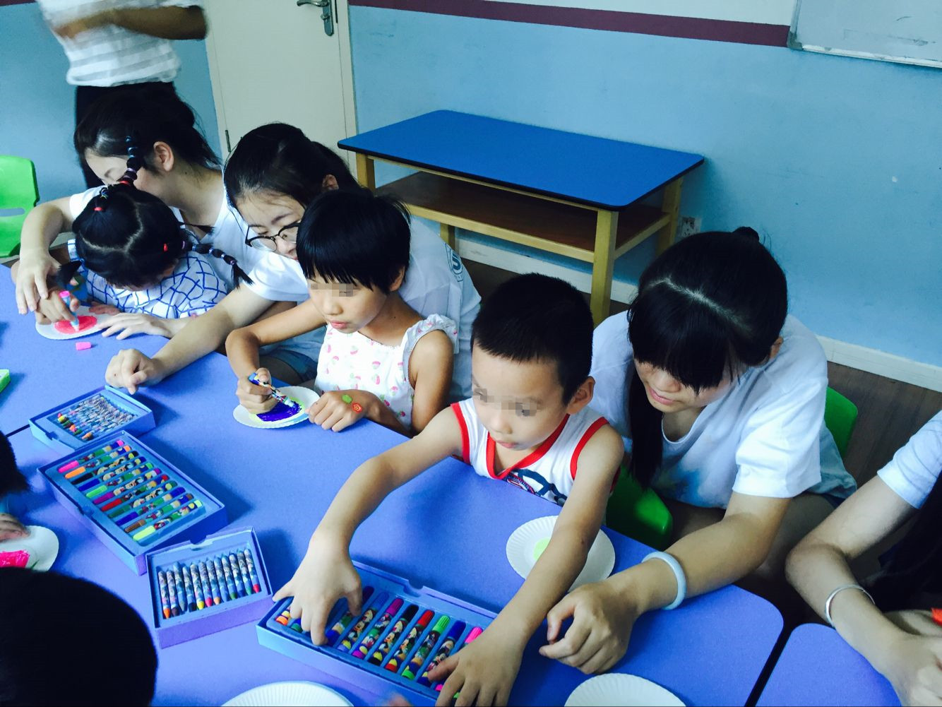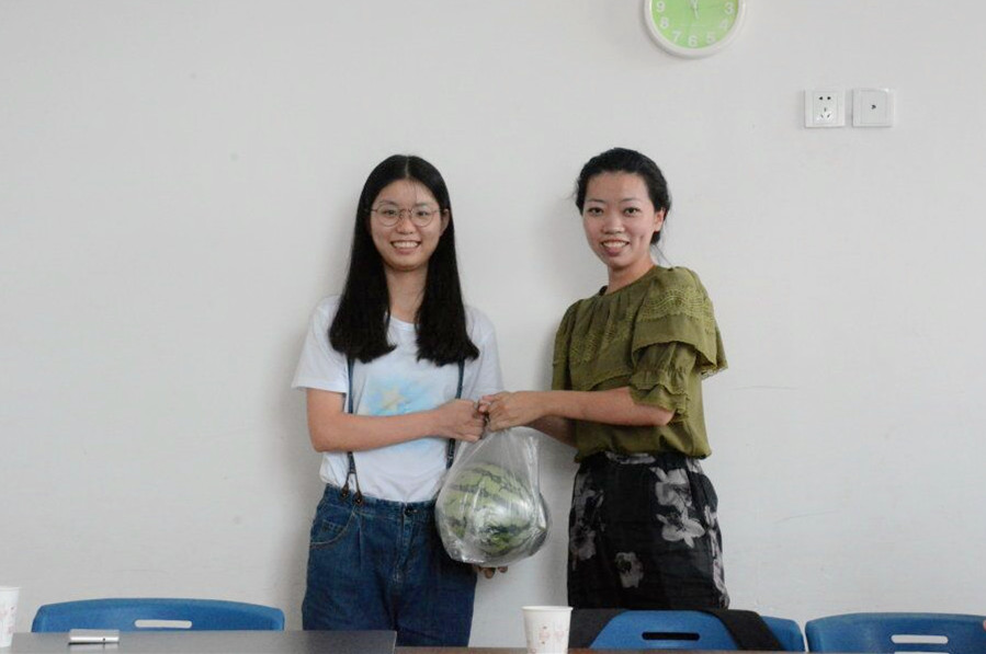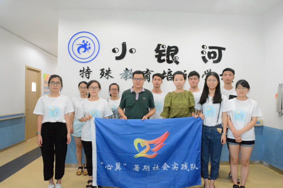 的胡瑜副院长(实践队指导老师)和学院辅导员严晓秋老师。老师给我们带来了夏日清凉的西瓜和冰红茶,对我们公益实践活动给予了大力支持。虽然物品并不贵重,但却给予了我们很多能量和前进的动力。老师对我们进行了简单但不乏热切的关怀慰问,大家围桌而坐,向老师们汇报了自己的实践心得。队长首先发言:“今年心翼主要分成三只小分队,小银河分队的同学主要负责的是教学这一方面,协助老师上课,帮助孩子们进行康复训练。在小银河的几天里,队员依照安排有条不紊地展开活动,积极完成实践基地老师分配的任务。我们不仅在教孩子学习,自己更是在进步,感谢队员和老师的付出。”胡院长也表示,只有真正参与到活动中去,有所触动,有所收获,才算是达到实践的目的。队员们也积极发言,纷纷表示自闭症的孩子虽然特殊,但却又与正常的孩子无异,上帝给这些孩子关了一扇窗却会给他们打开一扇门。自闭症的孩子们需要这个社会更多的关心与支持,照顾这些小天使让我们乐在其中忘却疲倦。爱星缘实践小分队也在欢身笑语中展开了一系列的活动。他们帮助的对象是一帮幼龄自闭症儿童,他们虽然有些行为怪异不擅长与人交谈,却不乏天真可爱。实践队的成员们都把他们当做普通的小弟弟小妹妹一般呵护对待。领着孩子们一起上音乐课、做操、完成手工作业。都说快乐是相通的,当这帮孩子的脸上洋溢出开心的笑脸,我们的队员变能感觉到无比的充实与幸福。我们想和这些折翼的小天使分享快乐传递爱。