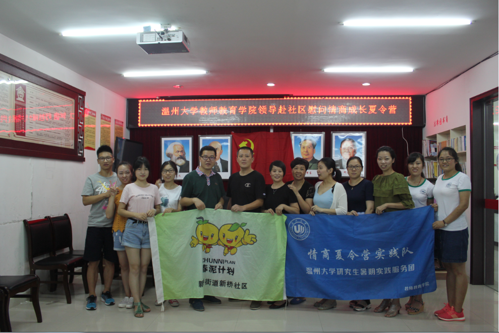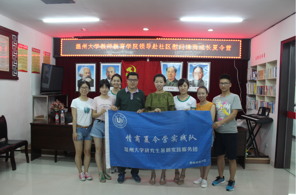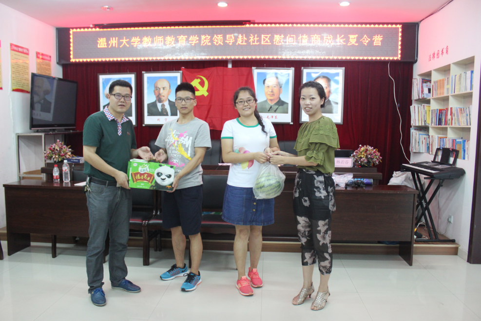 “情商夏令营”暑期社会实践队进行慰问与指导并给我们送来了解暑物品。并且与社区负责人等进行简短交流,然后对实践队队员进行深切慰问。