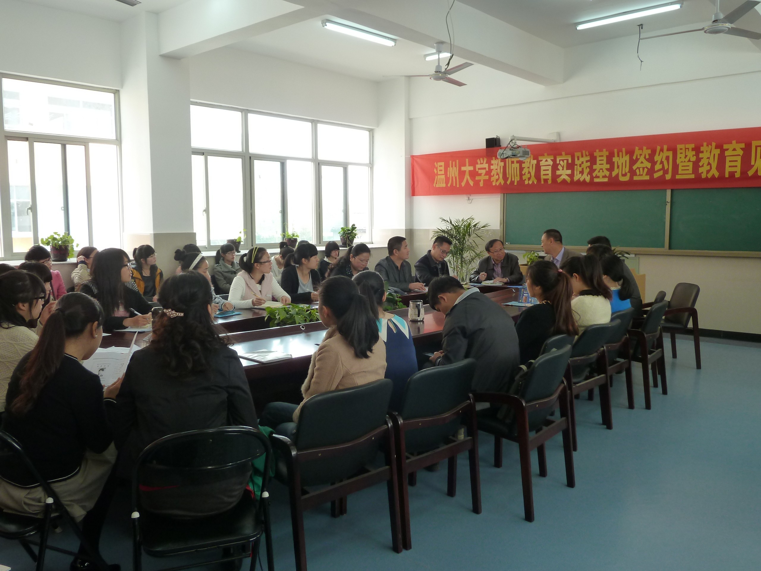 实践基地签约仪式暨教育见习入点仪式”正式开始了。本次仪式由蒋主任主持,林校长首先向我们简要介绍了该校的情况,并鼓励我们在见习时要深入课堂,深入校园,指出了课堂教学研究的重要性。接着温大教师p站视频
