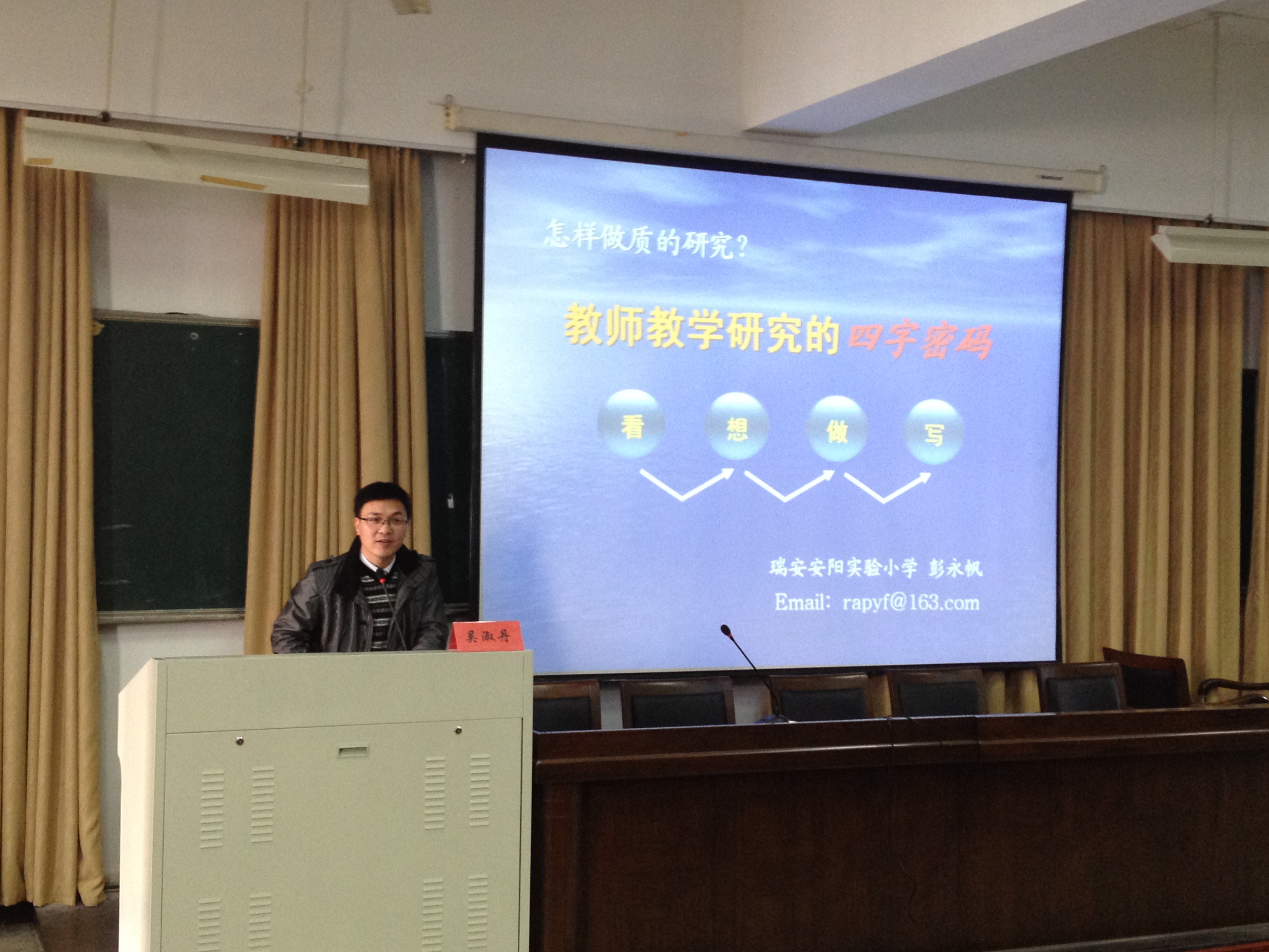 小教系在北校教育楼3-101举行了第四次名师大讲堂活动。此次名师大讲堂的特邀老师为瑞安安阳实验小学教学副校长彭永帆,讲座主题为:教学研究的“四字密码”。本次活动由小教系主办,小教工作室承办,小教系教师谭莉博士主持。