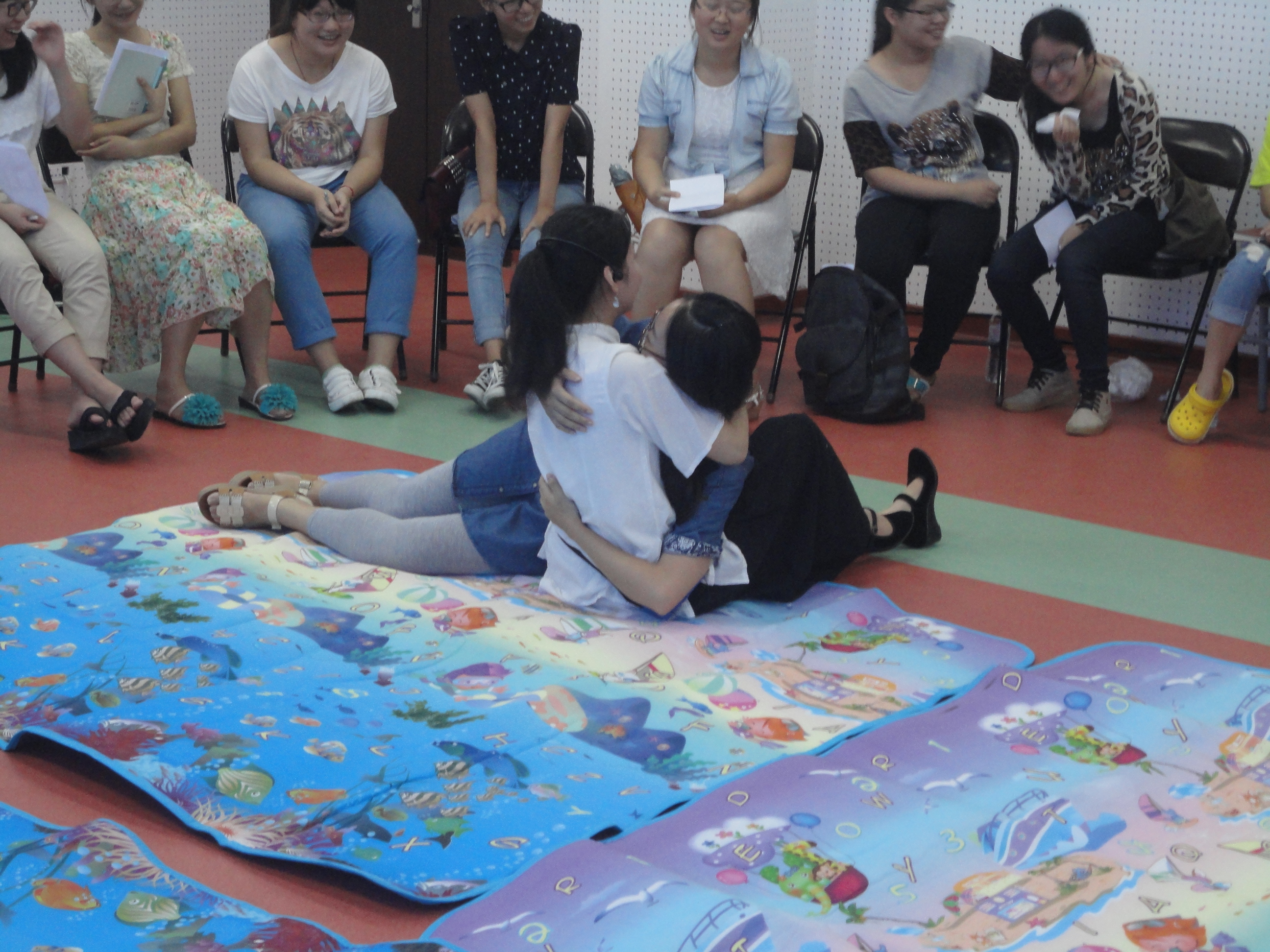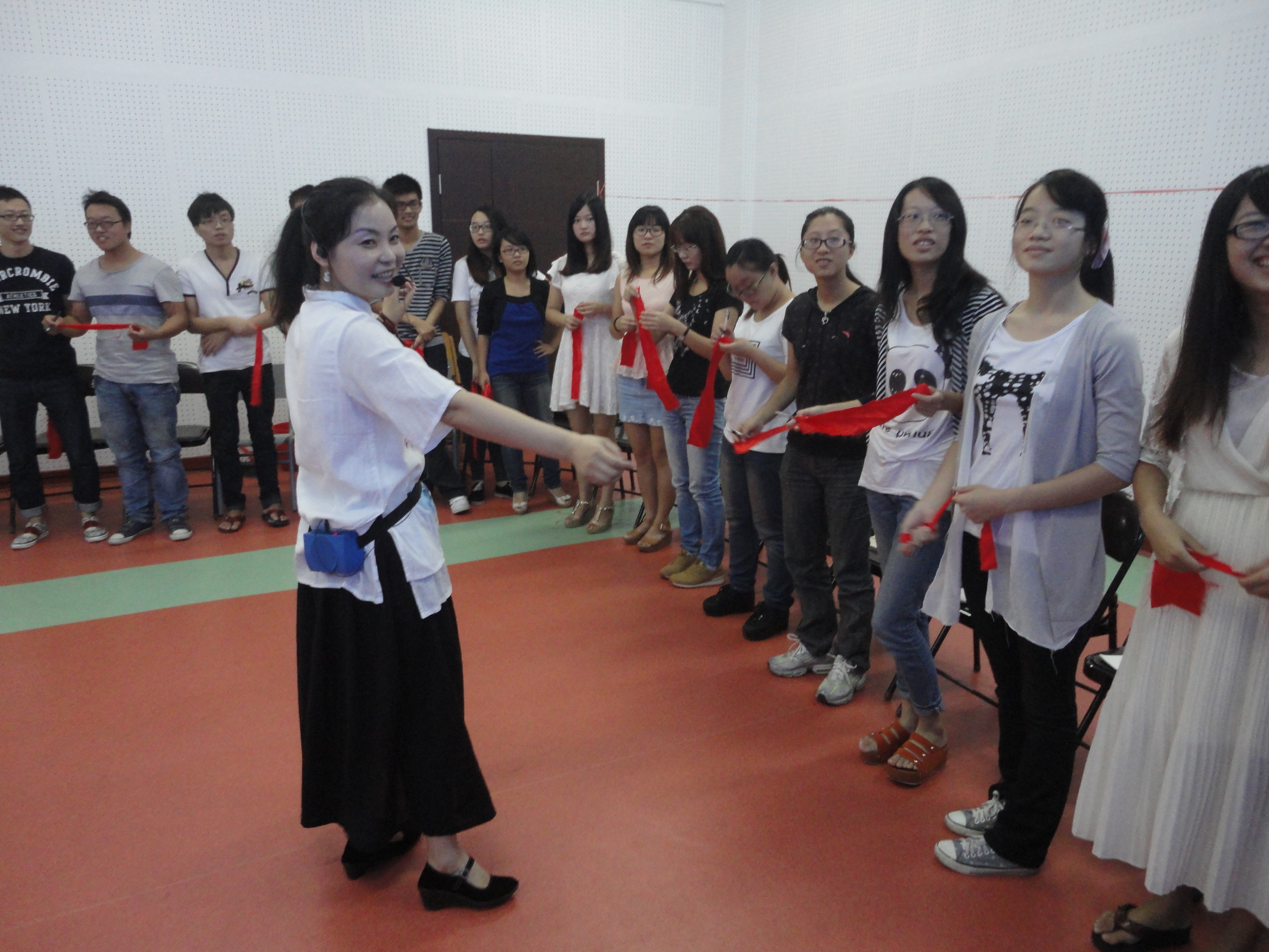 上午八点半,教室里的椅子围成了一个大圈,都已经坐满了学生,大家都期待体验音乐减压的效果。林信洁老师做了很多准备工作,先从理论入手,让我们有了一定了解后,就立刻进入体验环节。第一环节,热身阶段,通过把每个人都联接起来,打破人际的隔阂,促进交流。同时让我们在红布条上写下我们这节课希望学到的东西,然后亲手挂在绳子上,这叫做“心有千千结”。第二环节,“压力十年”,林老师通过催眠、音乐、画画、舞蹈,使我们宣泄自己的情绪。第三环节,体验怀抱,大家分别扮演母亲和儿女的角色,投入对方怀抱,用爱来滋养。最后大部分同学都实现了自己预期的愿望,解开了绳上的结。通过每个环节大家的分享,我们一步步深入内心,实现了音乐解压的目标。